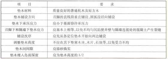 刃脚下应满铺垫木。一般常使用长短两种垫木相问布置,在刃脚的直线段应垂直铺设,圆弧部分应径向铺设。垫木的数量按垫木底面承压应力不大于0.1 MPa。