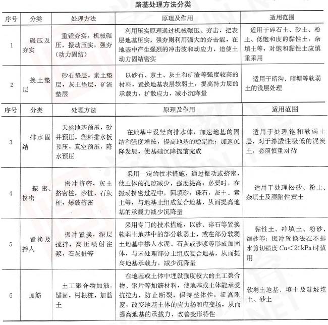 1.不良土质路基处理分类:土地改良、土的置换、土的补强等三类。