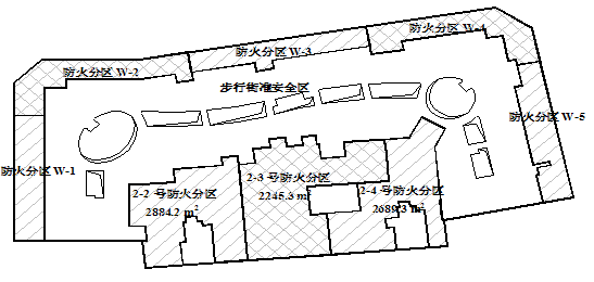 步行街二层和三层的楼板在不同部分开口,形成了多个中庭,通过贯通的中庭三层叠加计算步行街的建筑面积达到49 916.61㎡。步行街二层防火分区示意图如图 1所示。