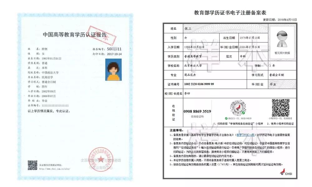 对于2002年以前的高等教育学历证书,以及2002年之后未在高校学生学历信息管理系统相关数据库中注册的高等教育学历证书,如有需要,可免费申请书面认证报告。目前该类学历认证报告可以网上申请了,图左侧为纸质版认证报告、右侧为电子备案表,都可以使用。