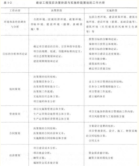 项目决策阶段策划的工作内容: 建设工程项目策划指的是通过调查研究和收集资料,在充分占有信息的基础上,针对建设工程项目的决 策和实施,或决策和实施中的某个问题,进行组织、管理、经济和技术等方面的科学分析和论证,旨在 为项目建设的决策和实施增值。 工程项目策划的过程是专家知识的组织和集成,以及信息的组织和集成的过程,其实质是知识管理的过 程,即通过知识的获取,经过知识的编写、组合和整理,而形成新的知识。建设工程项目决策阶段策划 的主要任务是定义(指的是严格地确定)项目开发或建设的任务和意义。 建设工程项目决策阶段与实施阶段策划的工作内容见表1—2。![]()