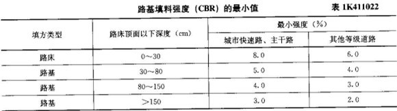 1.应符合设计要求和有关规范的规定。填料的强度(CBR)值应符合设计要求,其最小强度值应符合表1K411022的规定。