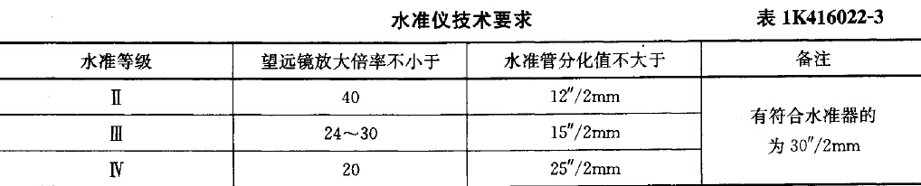 (4)Ⅱ、Ⅲ、Ⅳ等水准测量的仪器应符合表1K416022-3中的要求。
