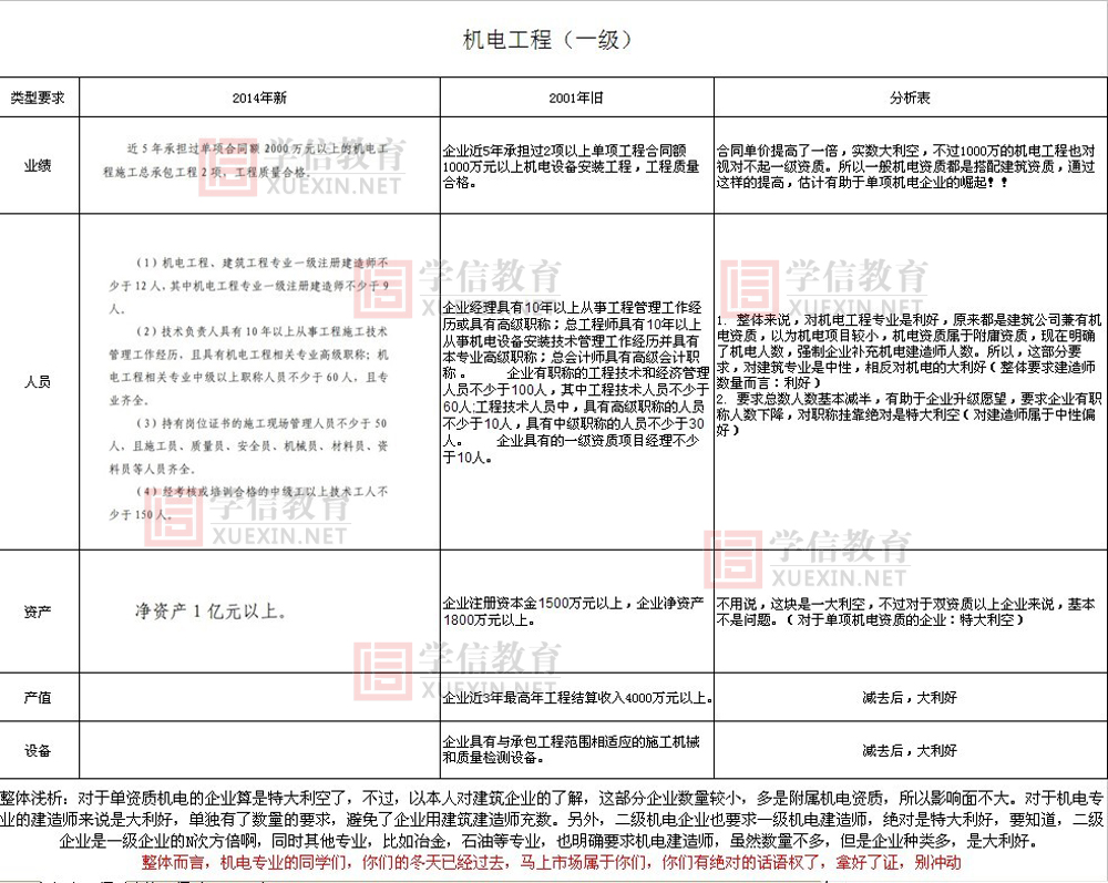 2014年11月6日建设部发文“住房城乡建设部关于印发《建筑业企业资质标准》的通知”,【查看官方原文】 根据最新资质要求,学信教育总结2014年新与2001年旧建筑企业资质标准对照分析表如下: